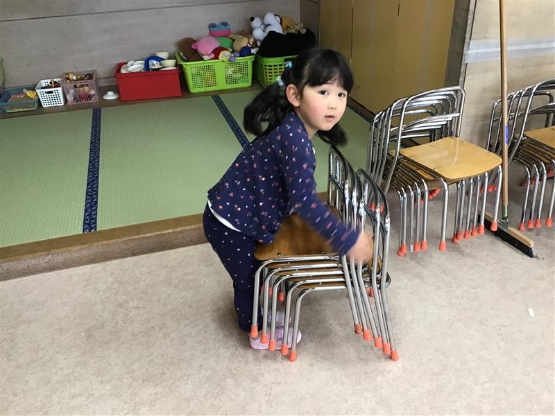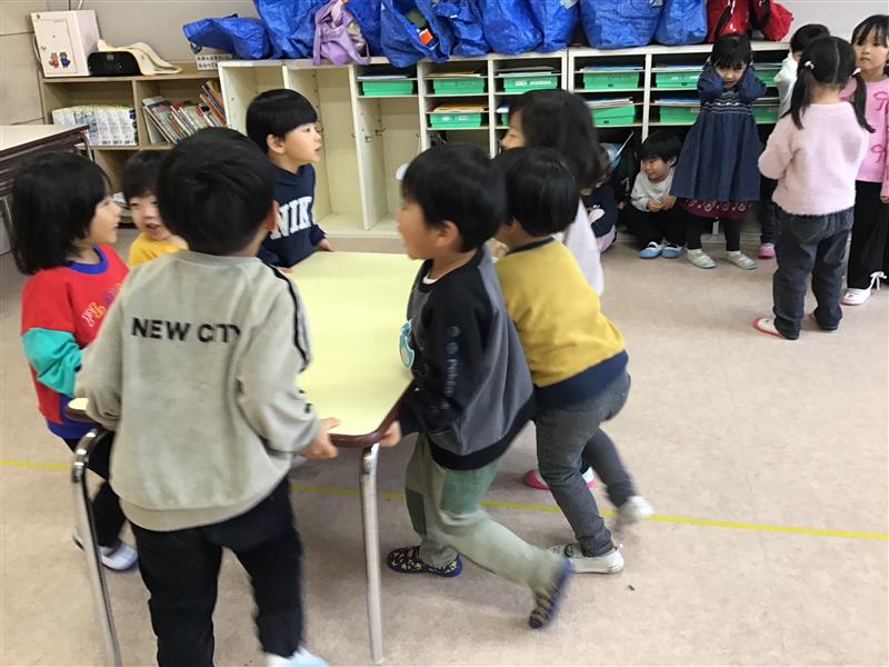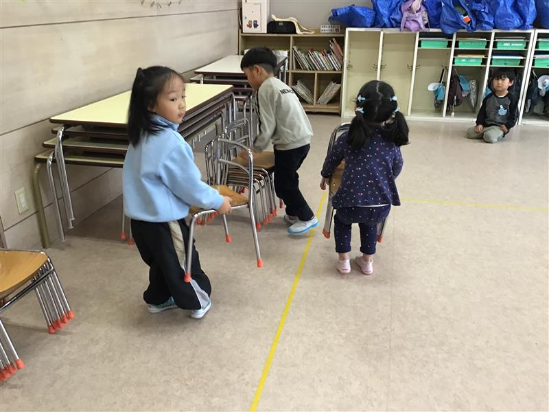 3学期が始まって年少さんは、年中さんに向けて、机を運んだりイスを片付けたりと、お手伝いをする姿が増えてきました。カッコいいおにいさん、おねえさんになるんだぁ〰︎♪机を運ぶのもおともだちと力を合わせて、イスも何個ずつだよぉ〰︎と数えたり教えたり助けあいながらがんばってますよぉ〰︎