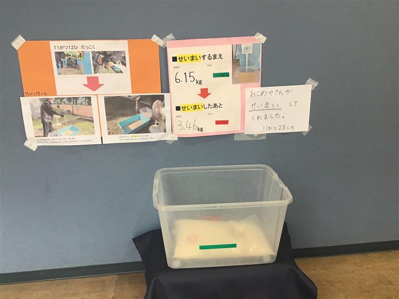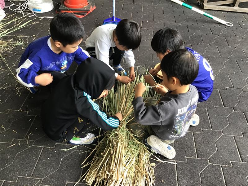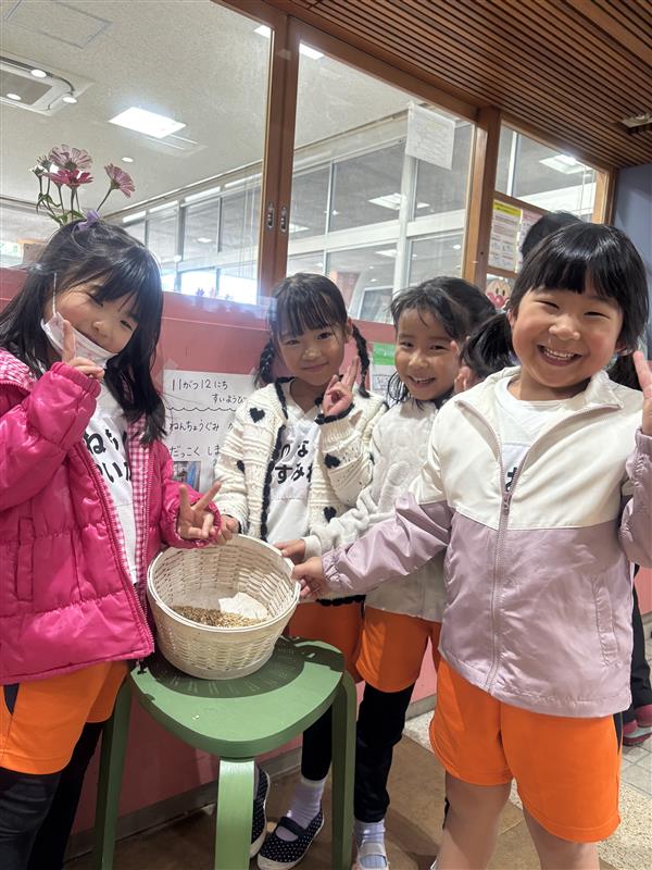 6月に園庭にある田んぼで田植えをした稲。子供たちは『大きくなったかなぁ?まだだねー 田んぼにトンボがいる!』などと、米ができるのを楽しみに見守っていました。稲は子どもたちの声に応えてグングン成長し、立派に成長しました。昔の足ふみ式の脱穀機を使い脱穀を行い、とても面白そうでした。初めは恐る恐る脱穀機に近づいてしてましたが、すぐに慣れて上手に脱穀をする事ができました。