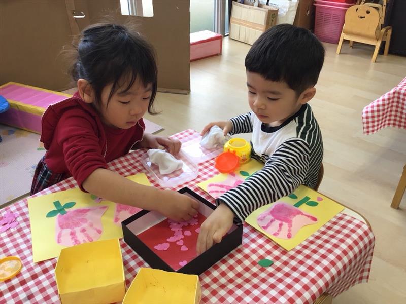 手形の周りには、小さな花びらの飾り付け。指先を使って一つ一つ貼る姿は真剣です。