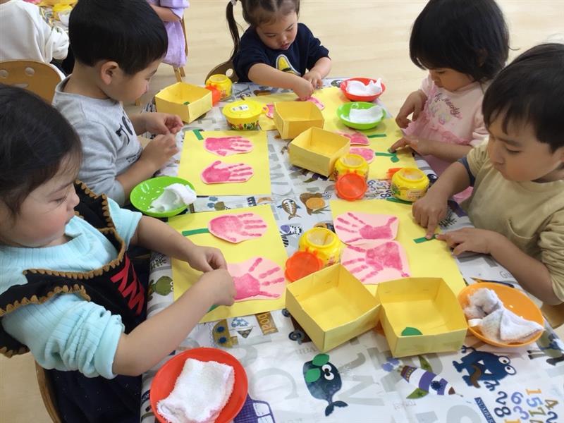 スタンプのスポンジに触れては冷たさに驚きを示したり、手がピンクに染まったことに、子どもたちの表情は、目を細めつつも、手のひらいっぱいに広がる色に、楽しさがあふれていました。