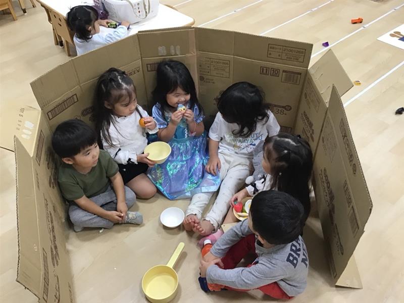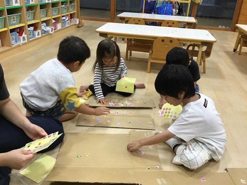 年少少組さんは、段ボールでお家を作りました。そのお家をもっと素敵にしよう♪🏘️と、色とりどりのシールを貼ってみんなでデコレーション!小さな手で一枚ずつ丁寧に貼る姿がとても真剣でした。完成した段ボールは、世界にひとつだけの特別な空間になりました。