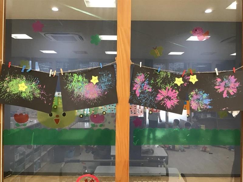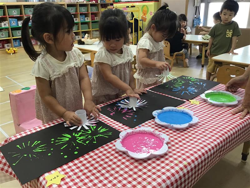 年少々のお友達が、絵の具遊びで「花火スタンプ」を楽しみました。トイレットペーパー芯を花火のように切り込み、絵の具をつけて、紙にポン!と押すと色とりどりの花火が広がります。「わぁー、きれい」と、繰り返し押しながら、色の重なりや形の変化を楽しみました。
