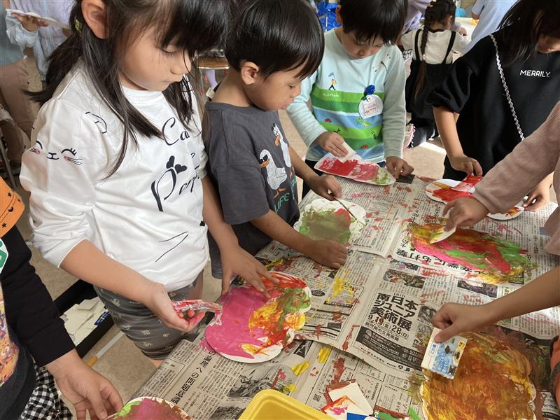 まずは絵の具🎨を使って色を塗り、乾いたら目や口をクレヨンで描きましたー♪
