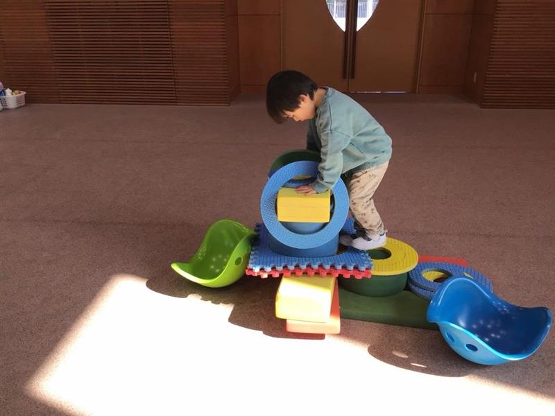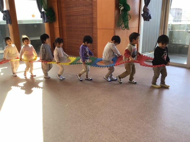 年少少組さんは、広々としたリズム室で、大型ブロックをつなげて電車ごっこを楽しんだり、形の違うブロックを組み合わせて自分なりの形を作ったりして楽しみました。「長い電車を作ろう!」と、話し合い力を合わせて長い電車を作っていました。完成すると、みんなで楽しそうに歩いていました。