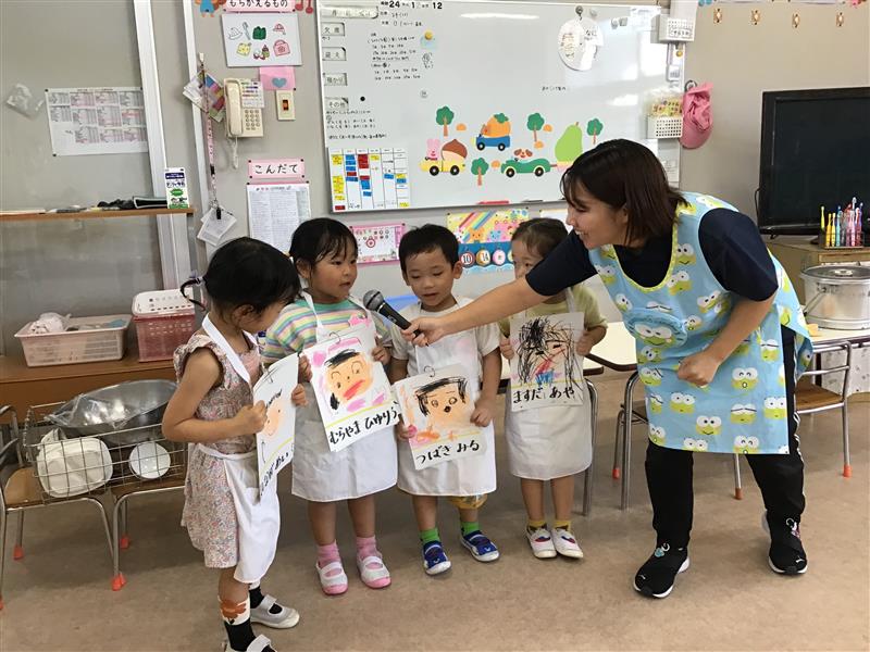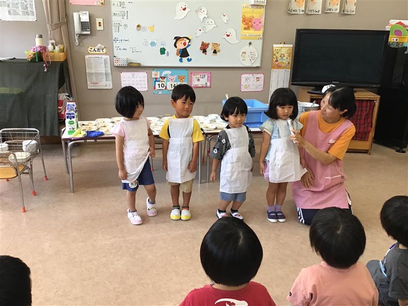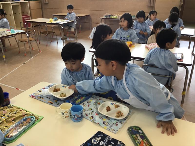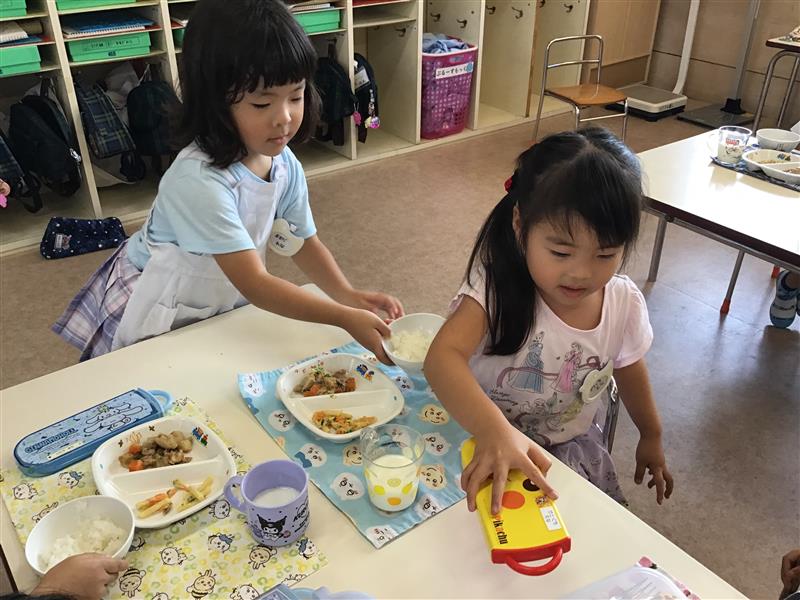 みんなの前で自分の名前を発表したり、お友達に給食を配膳したり(^^)