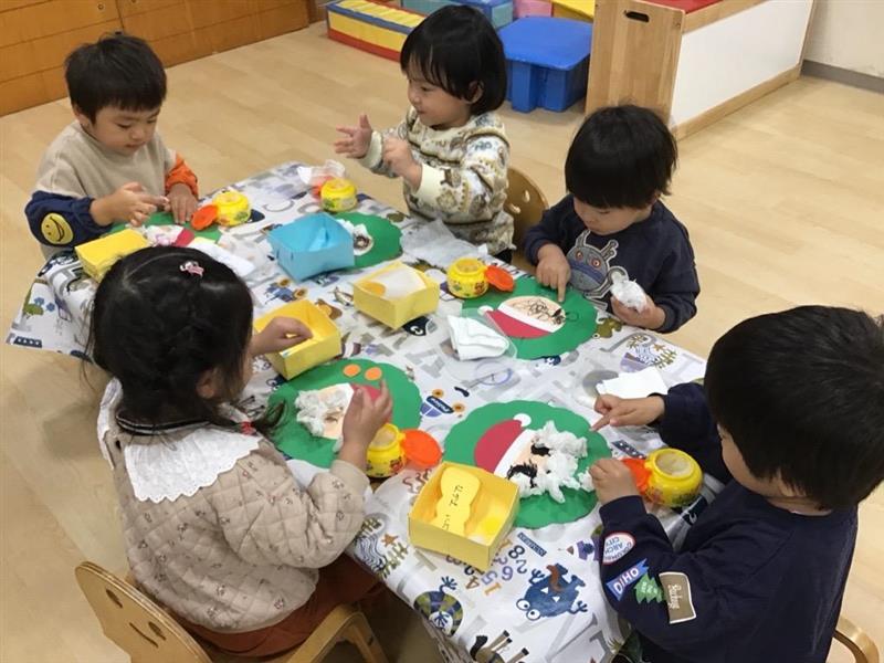 クリスマスを心待ちにしてしている子どもたち。クリスマスに向けて、サンタクロースの顔のリース作りを楽しみました。赤い帽子や白いひげをのりでつけて、一人ひとり違った表情のサンタクロースが完成し、保育室がクリスマスの雰囲気に包まれました。
