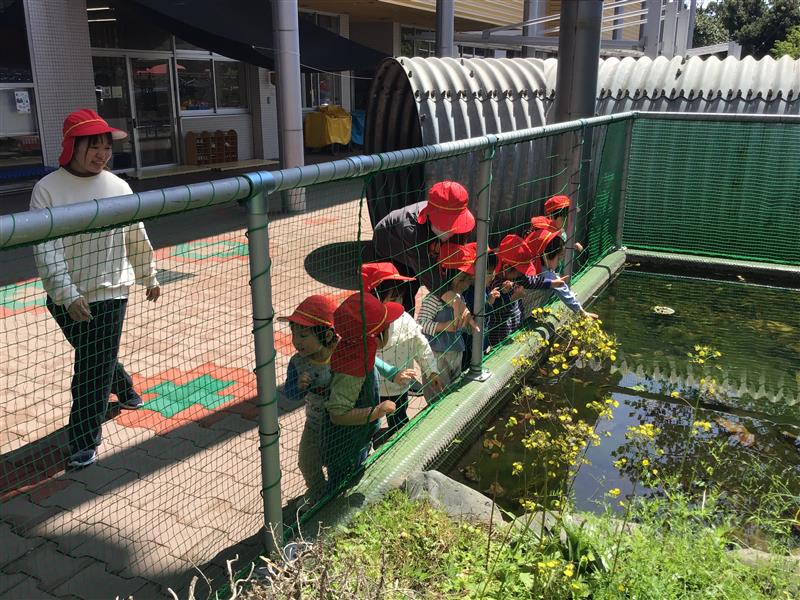 ぽかぽかお散歩日和りの中、お池に集まった子どもたち♪
