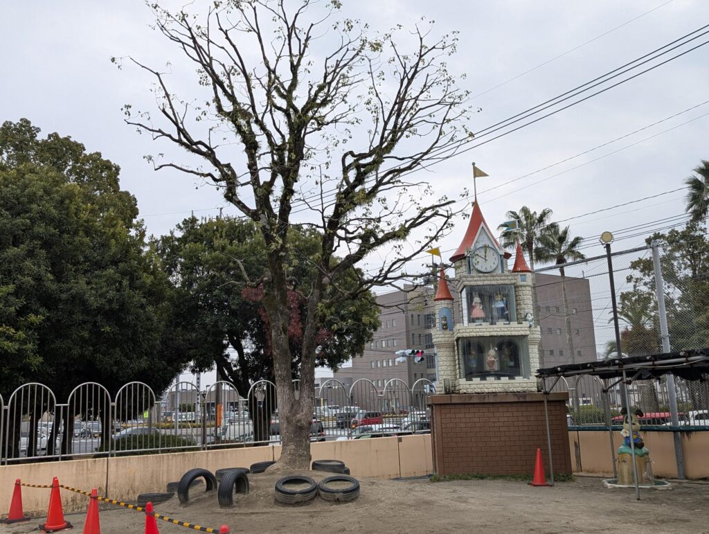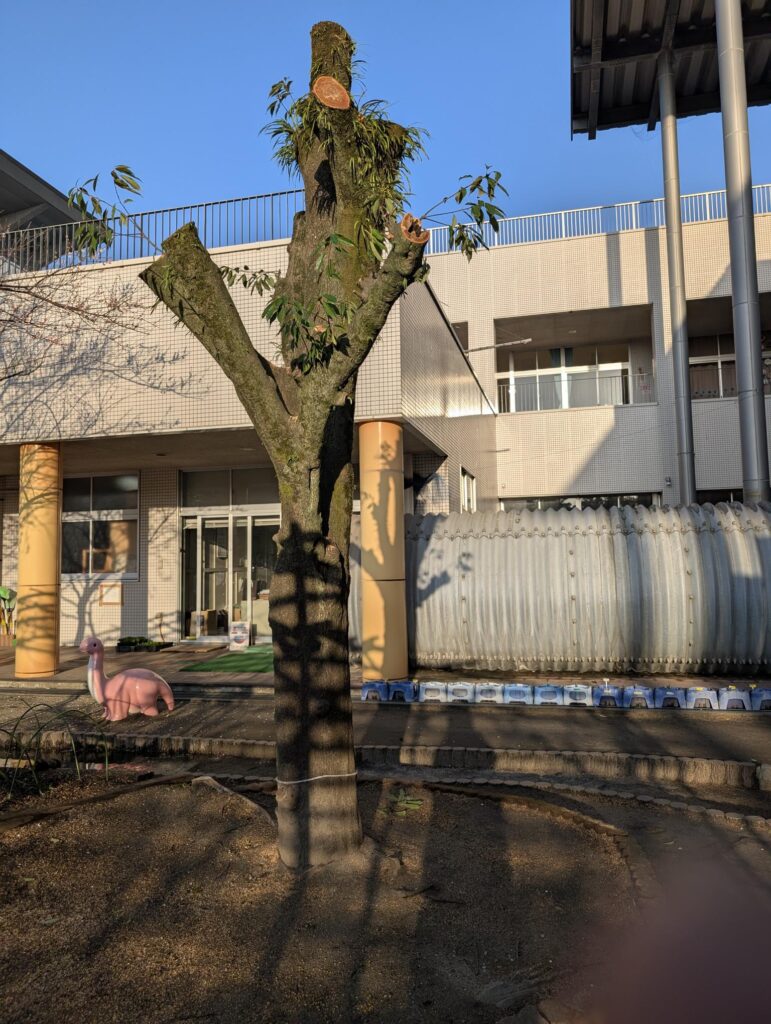 保護者の協力で、トンネル前と時計台横の樹木の剪定・伐採作業を行っていただきました。当日は高所作業車によるダイナミックな枝打ちに加え、パッカー車での処分までお手伝いいただき、園庭が明るく、開放感あふれる空間に生まれ変わりました。多大なるご協力に、心より感謝申し上げます。