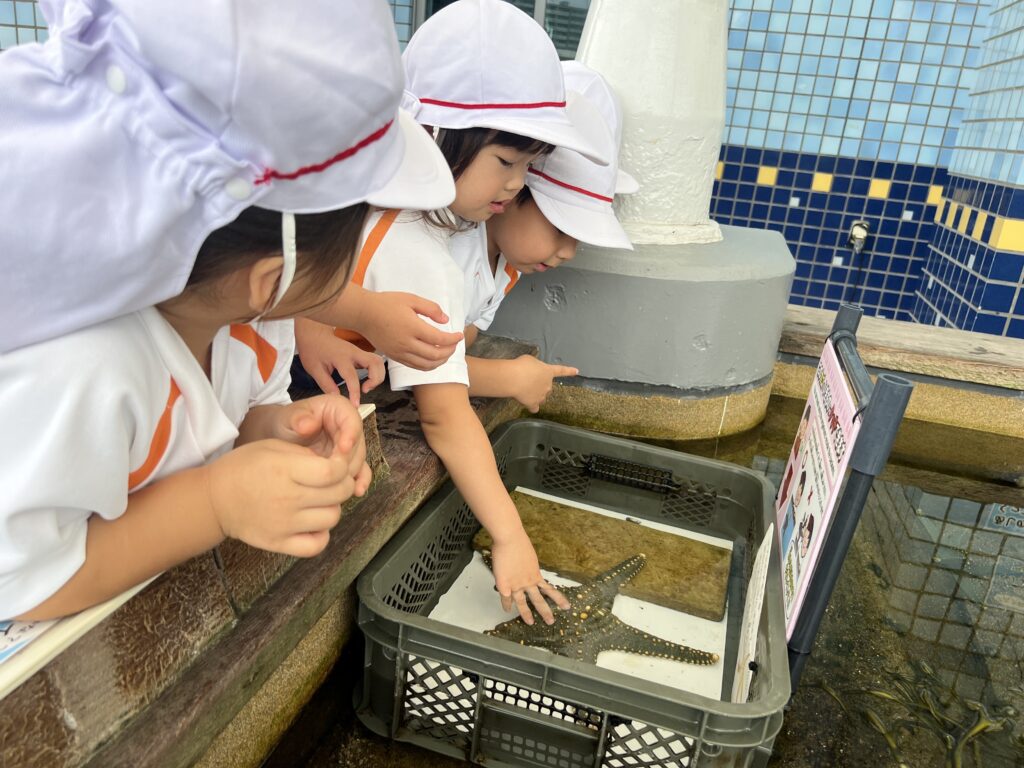 タッチプールでは実際にヒトデやナマコに触れてみました。「つめたい!」「かたい!」「やわらかい!」と驚きと発見がいっぱいでした。