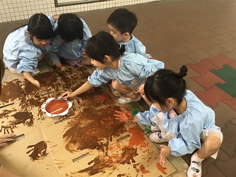 大道具作りでは、みんなで手形で色を塗り、大きな木を作りました♪