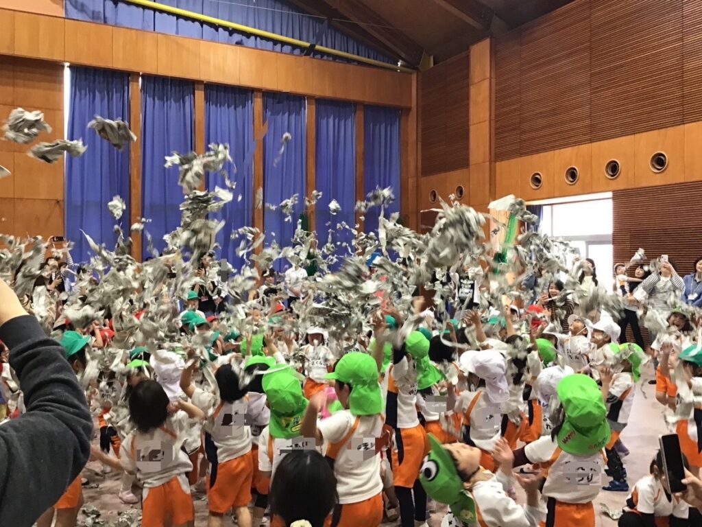 上からふわ〜っと舞う新聞紙のシャワーに、「きれい〜!」と歓声が響きました。
