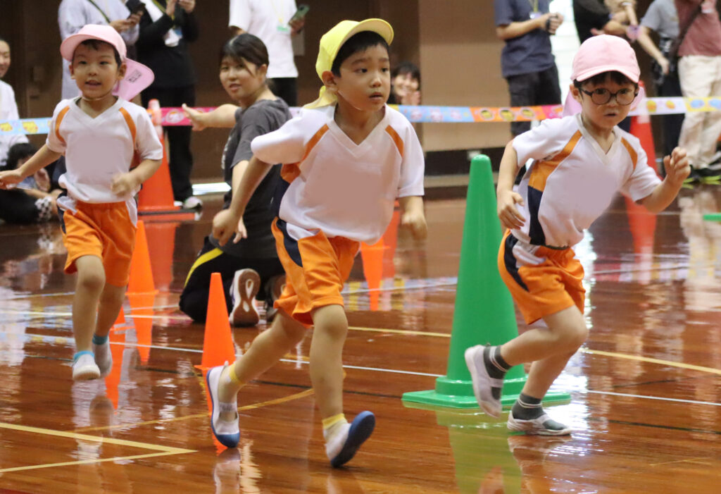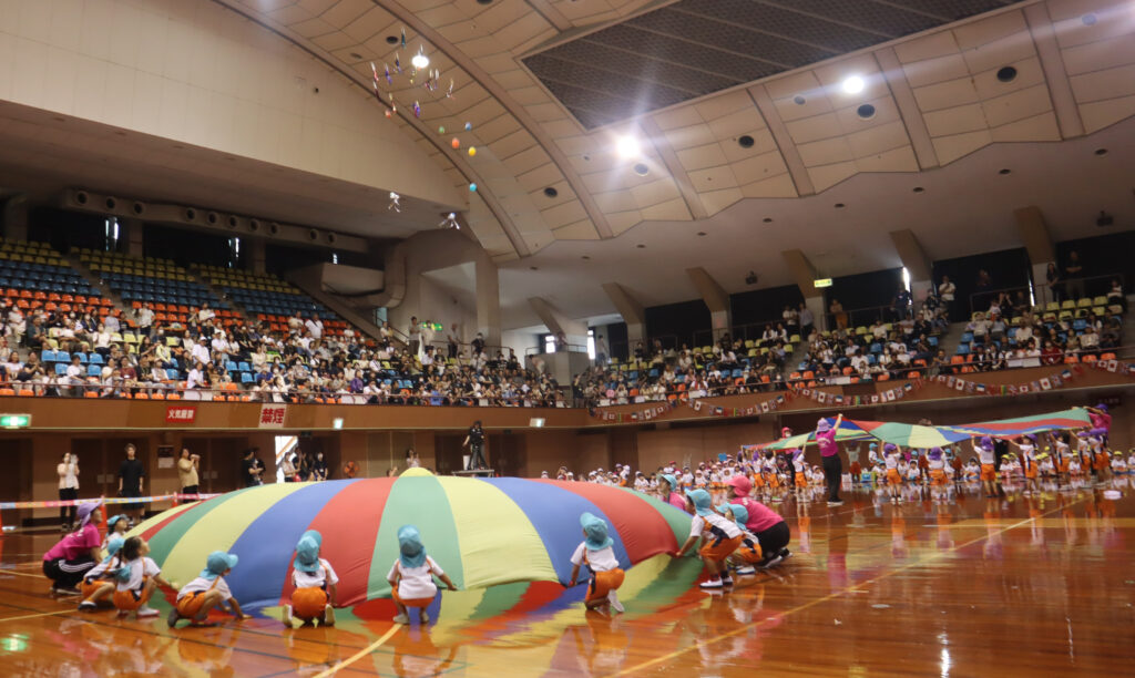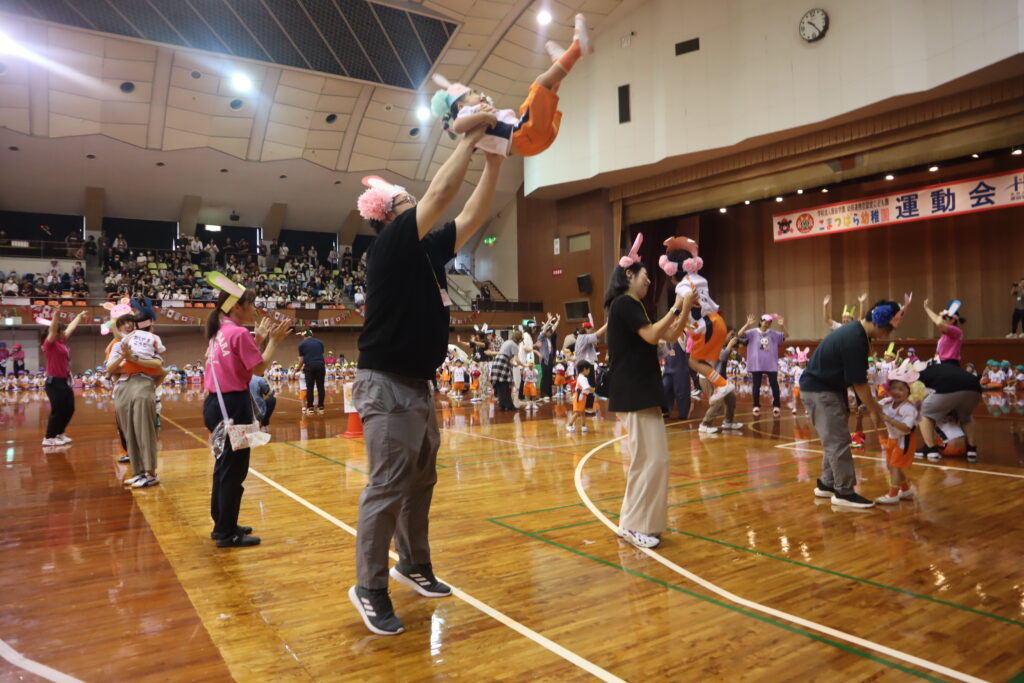 県体育館で運動会を開催しました。かけっこやダンス、バルーン、組体操、親子競技とバラエティに満ちたプログラムをみんなで楽しみました。