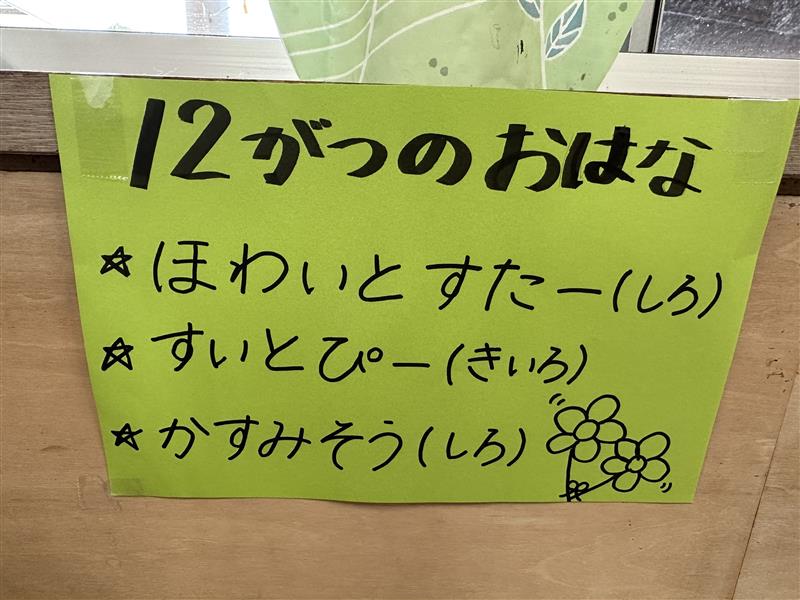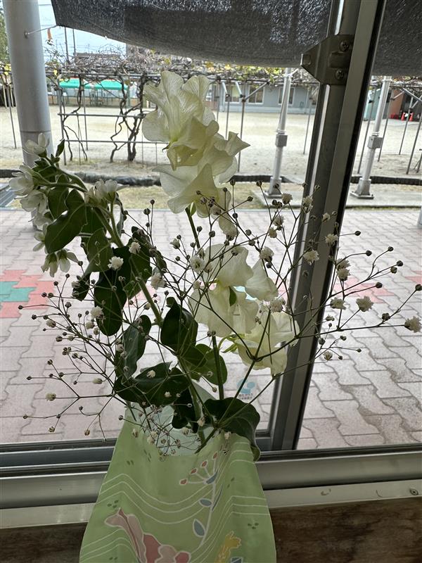 保護者会から毎月保育室にいただく花。職員室に届いた花を大切に保育室に運ぶお手伝いをしてくれます。「きれいだね。」 「かわいいね。」と会話しながら保育室へ。花の名前と一緒に飾り、みんなで眺めています。今月は、白い花でのアレンジで、保育室はさわやかで優しい雰囲気になりました。季節の花に親しみ、やさしい気持ちが自然と広がります。